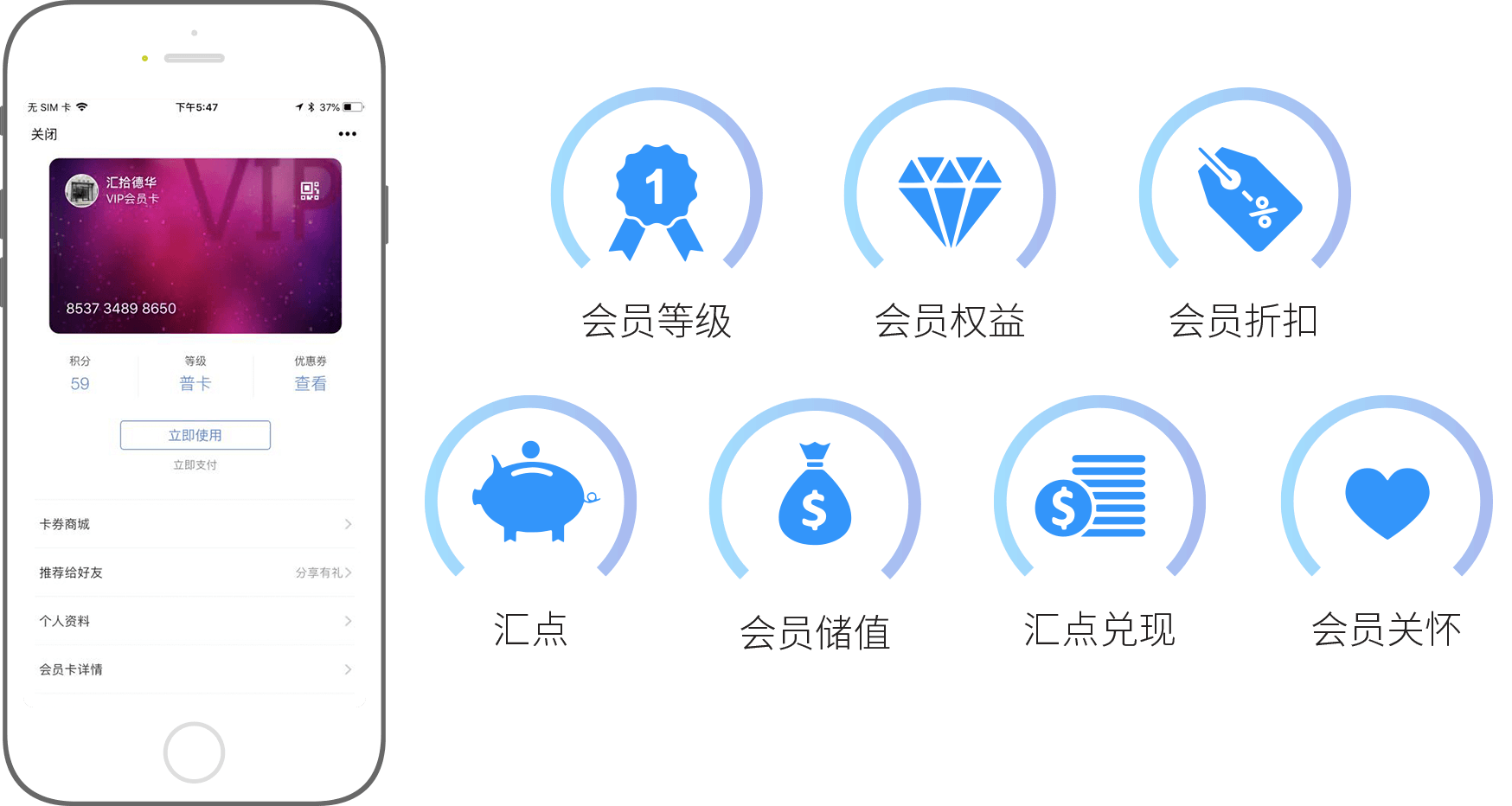 有效锁住多达10亿的微信用户成为潜在会员/粉丝,电子会员卡便捷时尚。完美实现会员余额、积分自助查询、自助储值,手机操作方便高效
